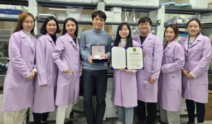 김용삼 진코어 대표(사진 맨 왼쪽 4번째)와 동사 연구진들이 머니투데이 주최의 '2021 제5회 4IR 어워즈(4th industrial Revolution Awards)'에서 '바이오헬스 부문' 대상을 수상하고 기념 촬영을 하고 있다. 유전자 가위 활용 치료제 분야로 수상했다.