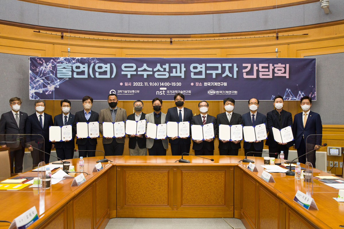 진코어 김용삼 대표(한국생명공학연구원 유전자교정연구센터 센터장 역임)가 지난 11월 9일 과학기술정보통신부 주관으로 열린 ‘1차관 출연(연) 우수 연구자 간담회’에서 ‘초소형 유전자가위 CRISPR-Cas12f 기술’로 우수한 연구성과를 인정받아 과학기술정보통신부 장관상을 수상하였다. (김용삼 대표: 사진 왼쪽에서 4번째)