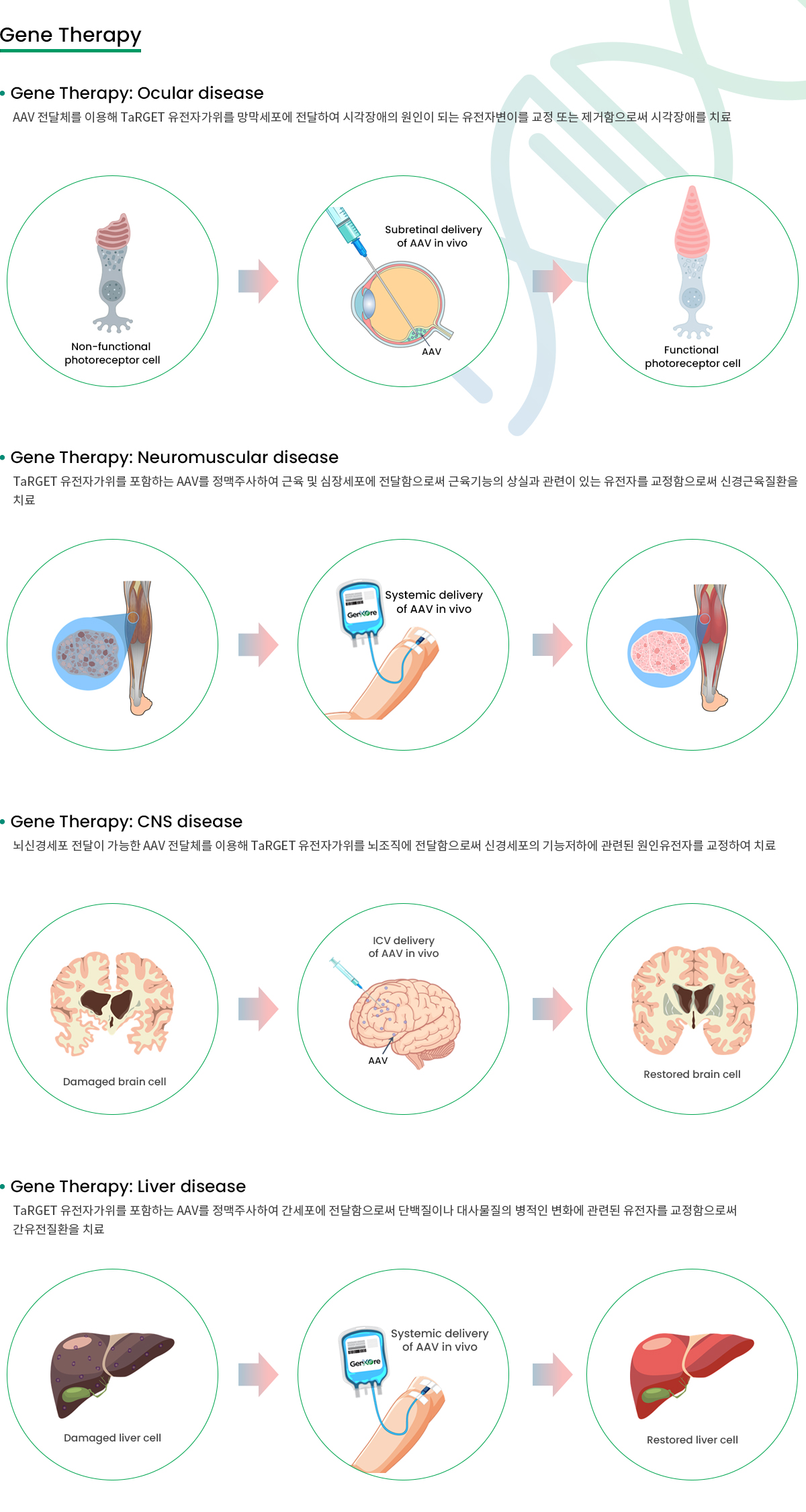 TaRGET 유전자가위를 포함하는 AAV를 정맥주사하여 간세포에 전달함으로써 단백질이나 대사물질의 병적인 변화에 관련된 유전자를 교정함으로써 간유전질환을 치료