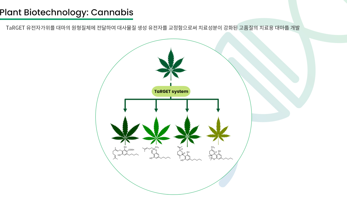 TaRGET 유전자가위를 대마의 원형질체에 전달하여 대사물질 생성 유전자를 교정함으로써 치료성분이 강화된 고품질의 치료용 대마를 개발